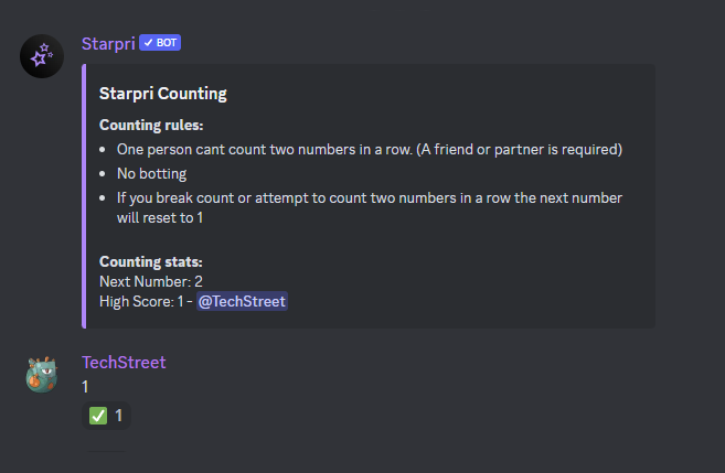 Introducing Starpri's innovative Counting Module! Designed to infuse a sense of community and lighthearted fun, this feature enables users to embark on a collaborative counting adventure with just a simple config setting on the dashboard. The module initiates a sequence where members take turns incrementing the count through their messages. What makes this experience unique is the bot's ability to meticulously track the progression, providing real-time updates and celebrating significant milestones. The Counting Module not only offers an engaging activity within the server but also cultivates a sense of camaraderie as members unite in the shared goal of maintaining the count without disruptions. It's a delightful addition to our Discord environment, fostering interaction and memorable moments among our community members.