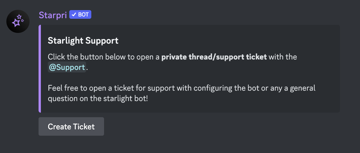 You can handle and expedite user requests, questions, and support tickets in your Discord channel using the Starpri bot ticketing system. This system assists moderators in setting up a specific ticketing system where users may conveniently submit their queries or problems. Users can open tickets by responding to messages or submitting commands when they require assistance. For the user, the system creates a thread and allocates it to the relevant moderator or support role. Your useful Starpri system makes sure that no issue is overlooked or gets lost in the server's chat channels, which can assist maintain an organised moderation process, speed up response times, and boost user happiness.